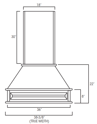 • 38-3/8"W x 20-1/2"D x 52"H = 22"Hood / 30"Shaft